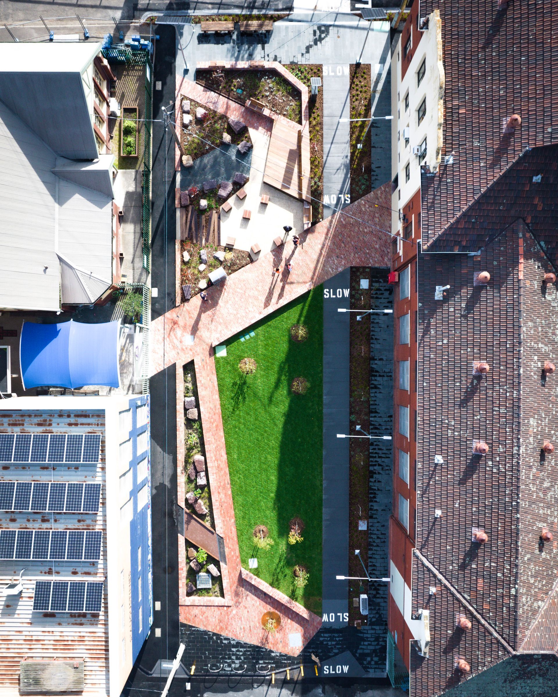 The street encourages a greener, healthier lifestyle with its dedicated bike path, complemented by convenient bike racks and a striking Corten Bridge that symbolizes community unity and connectivity. As evening falls, the area comes alive under the soft glow of solar-powered lights, highlighting the meticulous blend of bluestone and red brick paving that adds a classic yet contemporary feel to the street.